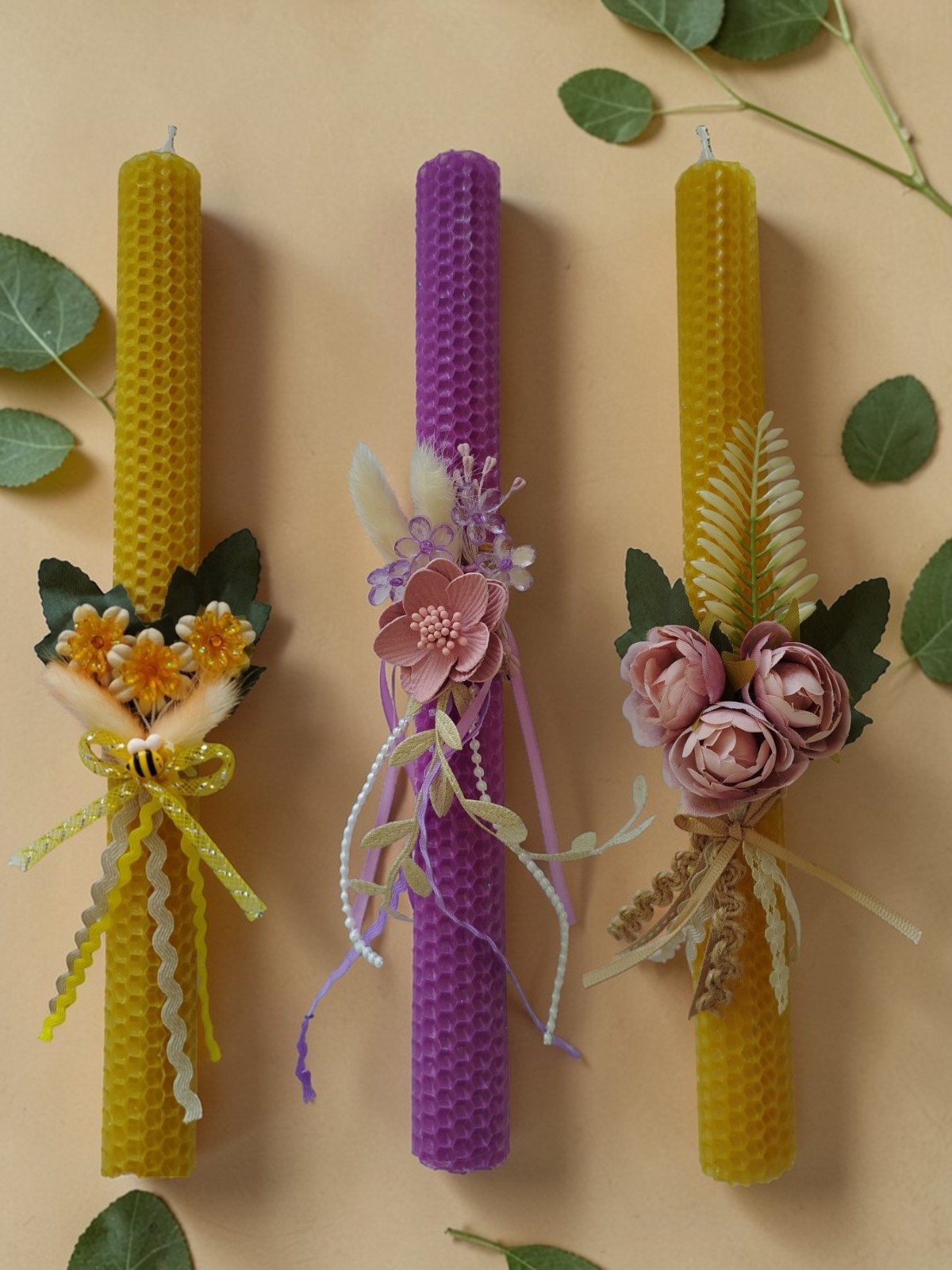 Λαμπάδες από μελισσοκέρι χειροποίητα διακοσμημένες με αποξηραμένα και υφασμάτινα λουλούδια.