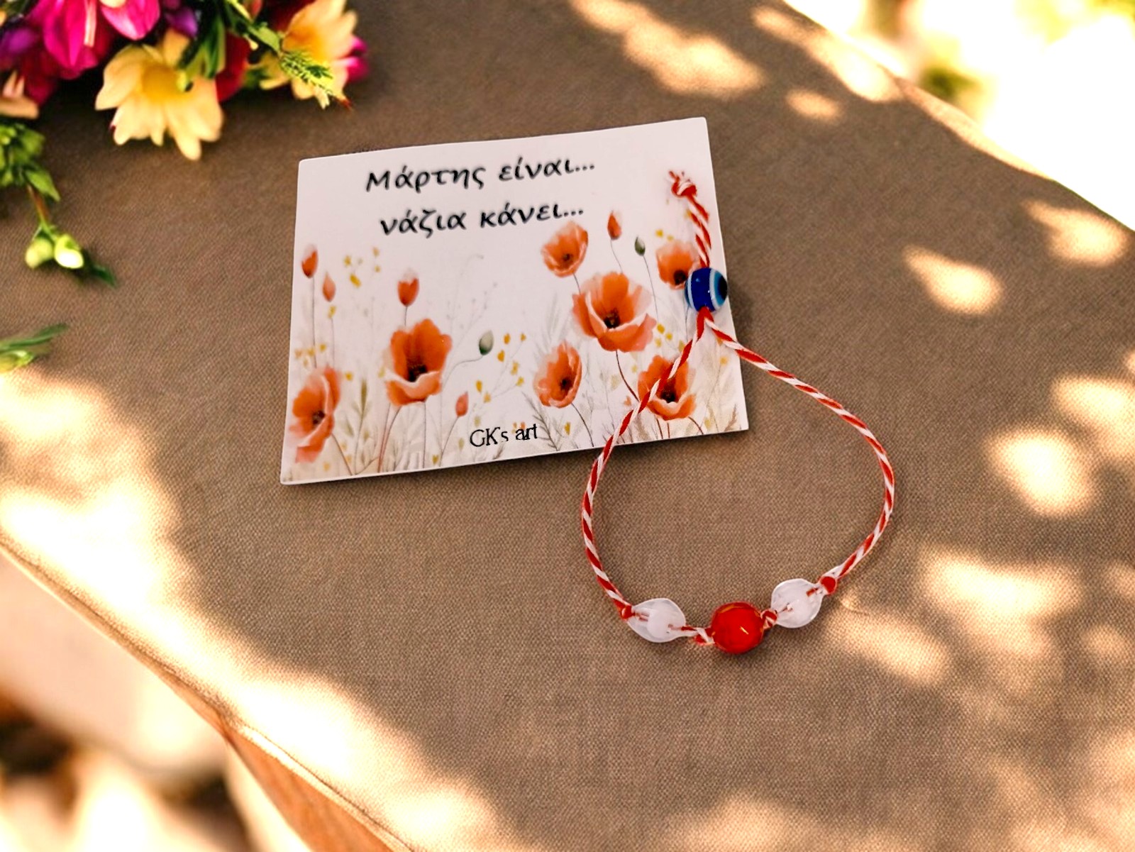 Χειροποίητο μαρτάκι με κόκκινο-λευκό κορδόνι και χαντρούλες.