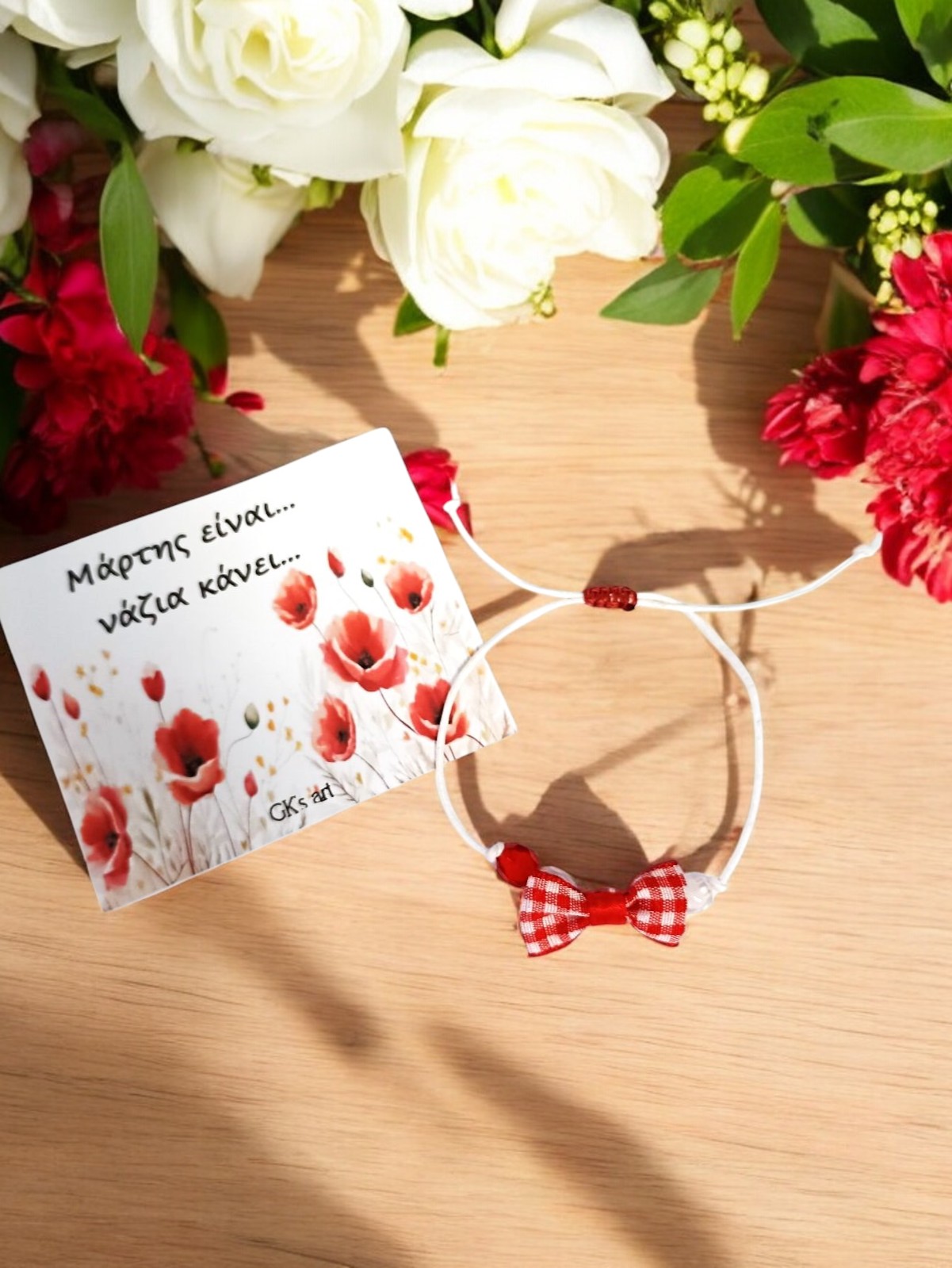 Χειροποίητο μαρτάκι με παραδοσιακό κόκκινο-λευκό κορδονάκι, χαντρούλες και φιογκάκι.