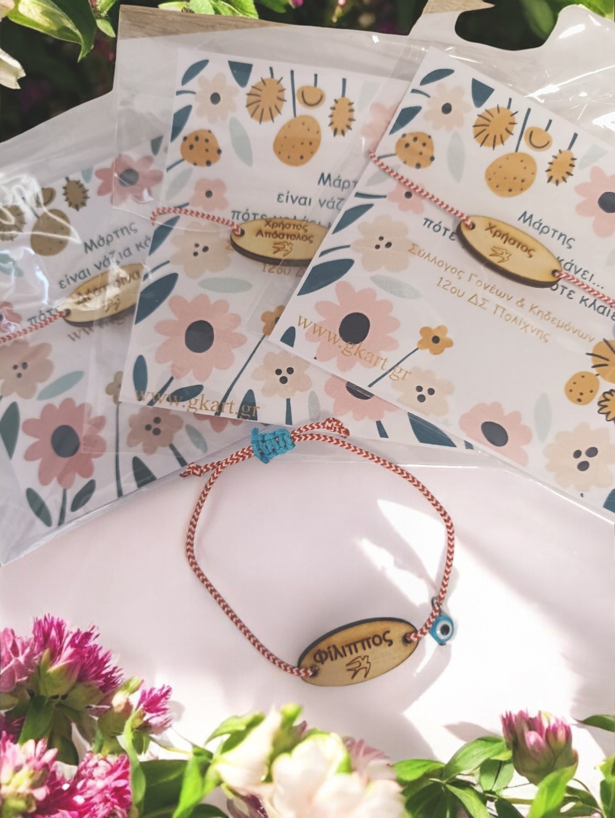 Χειροποίητο μαρτάκι με παραδοσιακό κόκκινο–λευκό κορδονάκι και ξύλινο στοιχείο με χαραγμένο το όνομα του παιδιού.