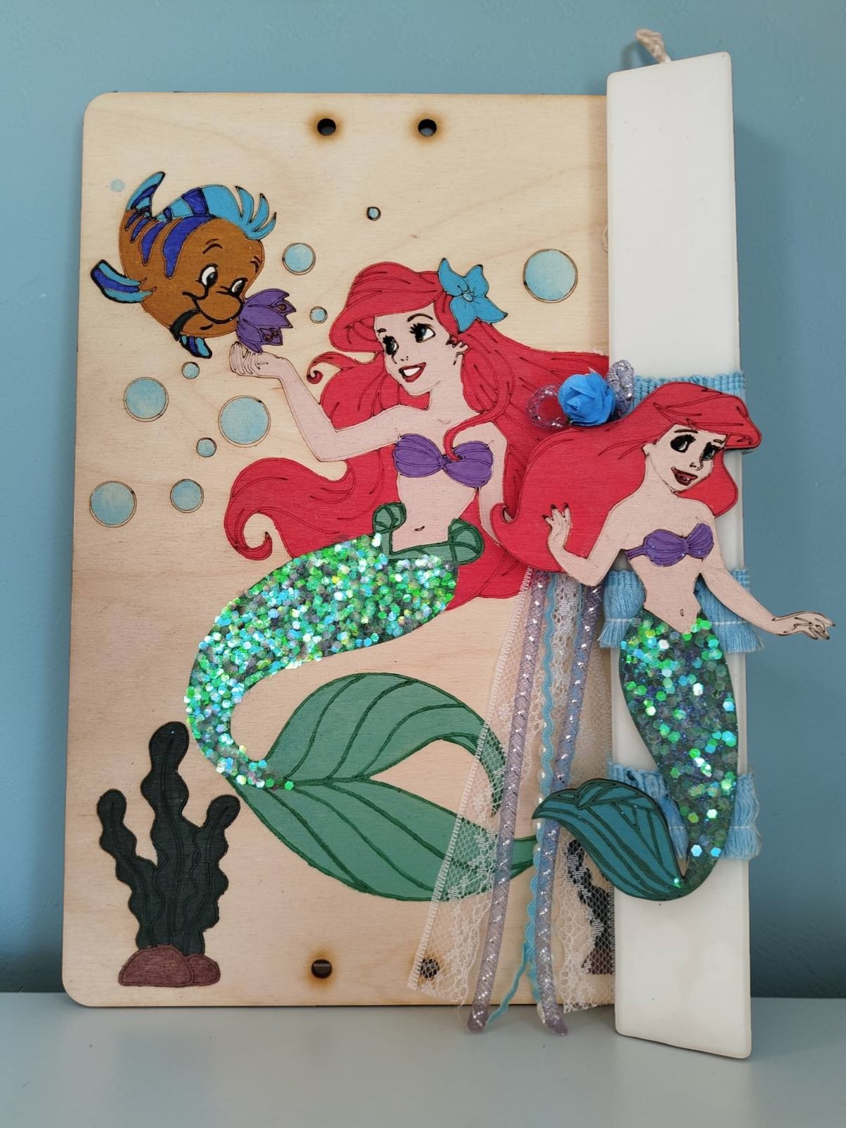 Μια μικρή πριγκίπισσα… έτοιμη να μπει στο δικό της παραμύθι. Χειροποίητη λαμπάδα 30εκ εμπνευσμένη από την αγαπημένη Αριελ και ξύλινο καδράκι χειροποίητα βαμμένο 32εκ
