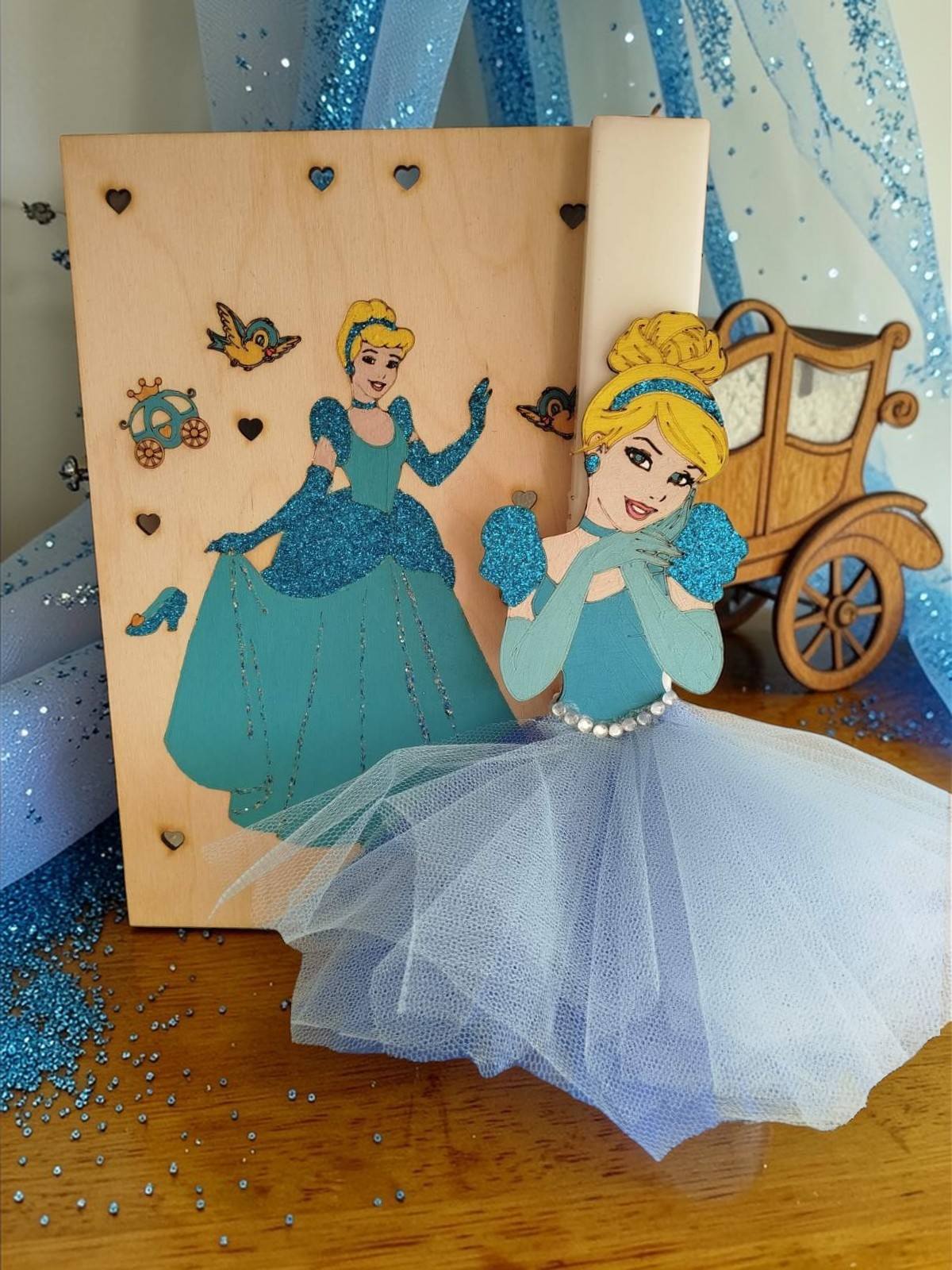 Μια μικρή πριγκίπισσα… έτοιμη να μπει στο δικό της παραμύθι. Χειροποίητη λαμπάδα 30εκ εμπνευσμένη από την αγαπημένη Σταχτοπούτα, με ξύλινο καδράκι 32εκ, τρισδιάστατη φιγούρα και αέρινη φούστα από τούλι που χαρίζει μοναδική λάμψη.